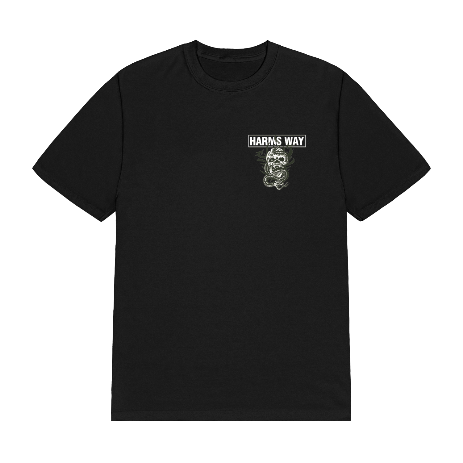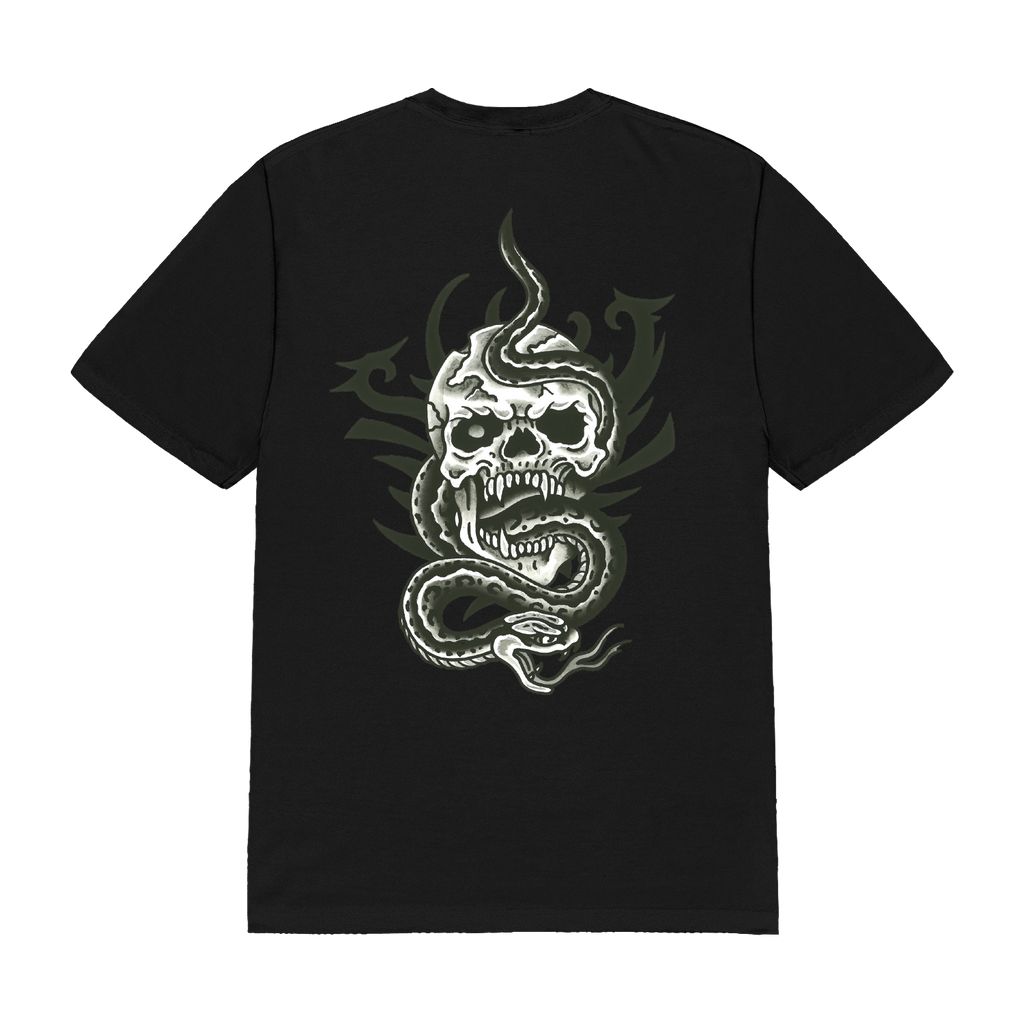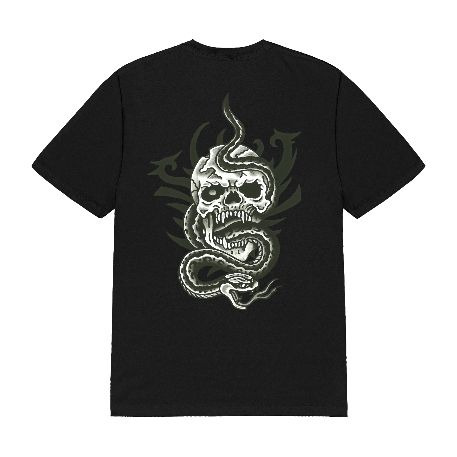 Screen printed on a black 100% ring-spun heavyweight cotton t-shirt.